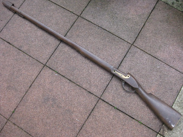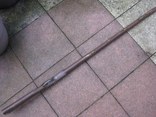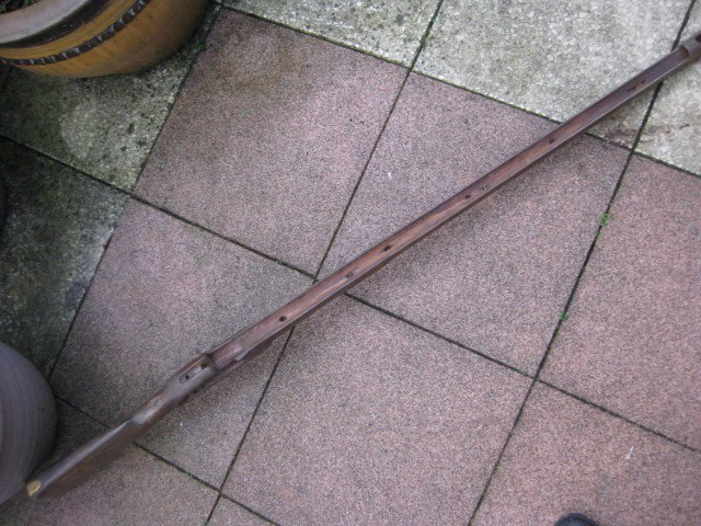Mit Dabei ist noch ein Lade-/Setzstock aus korrodiertem Eisen ohne Abbildung. Verbaut war darin der Lauf und das Steinschloß eines britischen Infanteriegewehrs Brown Bess. Der Gewehrschaft hat eine Gesamtlänge von 140cm, also Sperrgutversand. Die vorhandenen Beschläge sind aus angelaufenem Messing. Der vordere Schaftabschluß und der Ladestock sind aus flugrostigem Eisen. Eine günstige Gelegenheit zum Komplettieren eines Gewehrs.