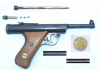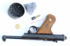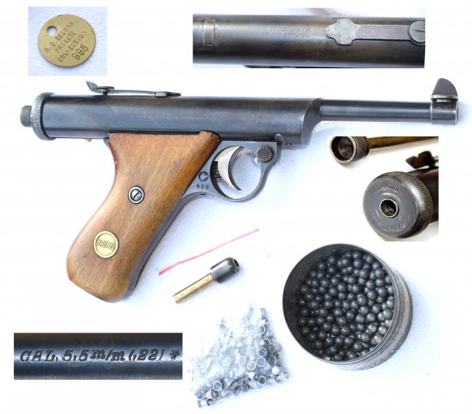 Angeboten wird eine gut erhaltene und voll funktionstüchtige Haenel Repetier-Luftpistole Modell 28 Rep. in seltenerem Kaliber 5,5mm. Diese Pistole stammt aus der berühmten Beeman-Sammlung aus den USA. Die Feder sehr straff und die Dichtungen sind in Ordnung. Die Schussleistung ist mit 5,5mm Rundkugeln oder mit 5,5mm Diabolos (die aber nicht länger als 5,5mm sein dürfen!) sehr gut. Außer leichten Gebrauchsspuren sind keine Fehler vorhanden (Fotos sind Teil der Beschreibung). Mitgeliefert werden 5,5mm Rundkugeln, passende 5,5mm Diabolos ein "Pellet-Sizer" und eine Kopie aus einem alten Katalog zur Pistole.