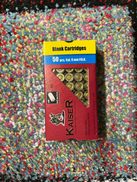Zum Verkauf steht eine Packung 9mm PAK der Marke Kaiser für Schreckschuss Waffen.