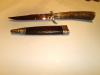Jagdliches Messer, Klinge sieht ungebraucht aus, guten Zustand.. Markung vorhanden aber kaum lesbar, könnte s//s heißen. Griff in Hirschhornausführung mit Metallplatte zum Abschluss. Messerscheide aus dunkelbraunem Leder mit Metallabschluss oben und unten und zum Kropf passend, um ein versehentliches Abrutschen zu verhindern. Scheide Gesamtlänge 12 cm, Breite oben 3 cm. Messer Gesamtlänge 22,5, Klingenlänge 11 cm, Breite 2 cm. Durch das Blitzlicht sind auf dem Foto die hellen Stellen entstanden. Nur die obere Stelle ist die Markung.