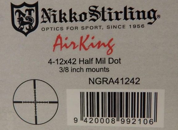 Verkaufe aus Nachlass ein neuwertiges Präzisionszielfernrohr Modell Nikko Stirling Gold Crown Air king 4-12-42 mit dem hochwertigen Half Mildot Absehen..Präzise Klickverstellung,Mehrschicht-Vollvergűtet,helles klares Bild volle Parallaxen -Einstellung von 8 Meter bis unentlich.Mittelrohr 25,4. Perfekt fűr Jagd,Schießstand,Freizeitluftgewehre ,Prellschlagfestigkeit selbst fűr stärkere Kaliber.Dioptrinausgleich.Zustand neuwertig, selten oder auch garnicht benutzt..mit Orginalverpackung. Ohne Montage,so kann jeder fűr sich selbst entscheiden welche Montage fűr welches System. Schauen Sie sich die Bilder gut an,diese sind wesentlicher Bestandteil der Beschreibung(versicherter Versand)da Privatverkauf ohne Garantie oder Rűcknahme
