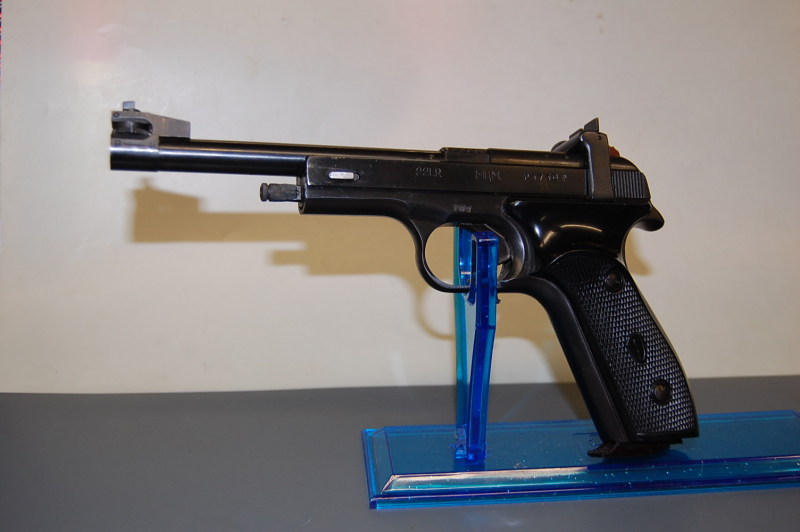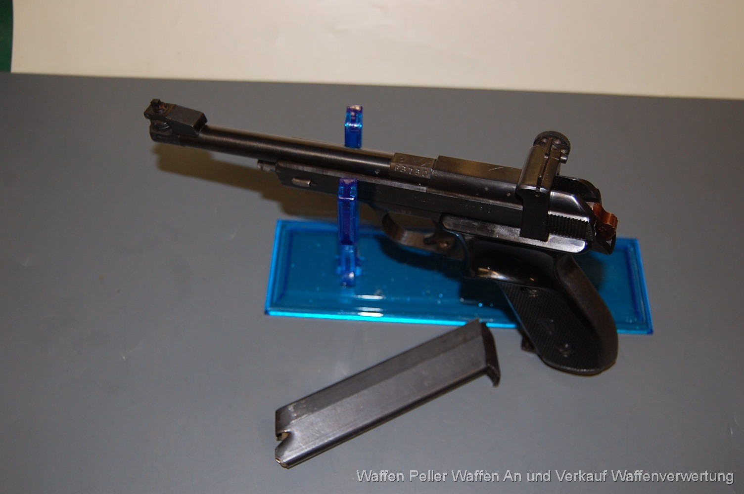 einstellbarem Triggerstop, außenliegendem Hahn, seitlicher Sicherung, 10-Schuß Magazin. Kunststoffgriffschalen mit Daumenauflage. Lauf sehr gut, Brünierung 99% Gebrauchtwaffe, sehr gut + Reservemagazin