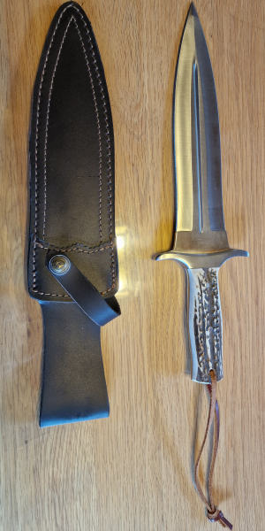 Hochwertig verarbeiteter Saufänger mit Fangriemen, durchgehende Klinge aus rostfreien 440 C Stahl, mit Hirschhorngriff und stabiler Sattellederscheide.