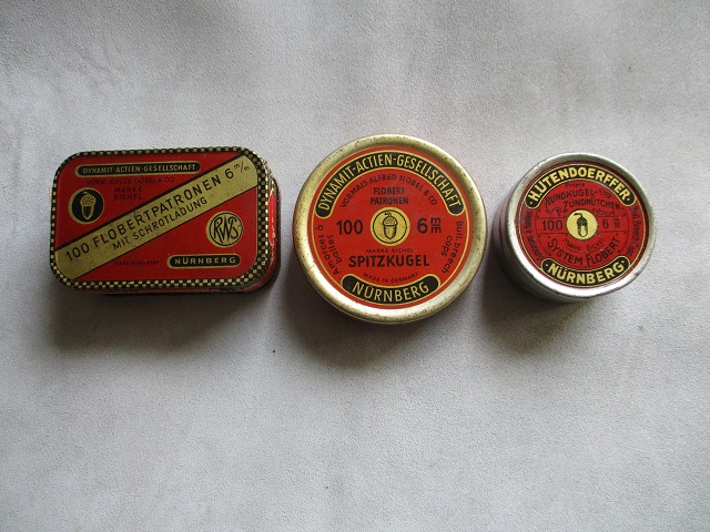 Ich biete aus meiner Sammlung: 3 leere Blechdöschen 6 mm Flobert. Von links nach rechts: Dynamit AG mit Schrotladung, Dynamit AG Spitzkugel, H.Utendoerffer Rundkugel. Alle 3 gut erhalten, sammelwürdig.