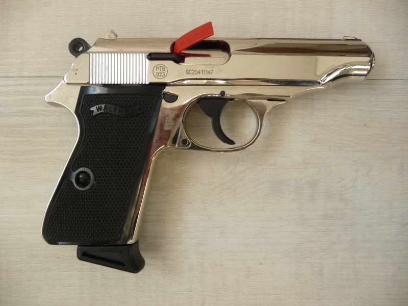Eine Schreckschusspistole von Umarex Walther PP Kaliber 9mm P.A.K. Chrome / poliert (polished chrome plastic grips) PTB 923.
