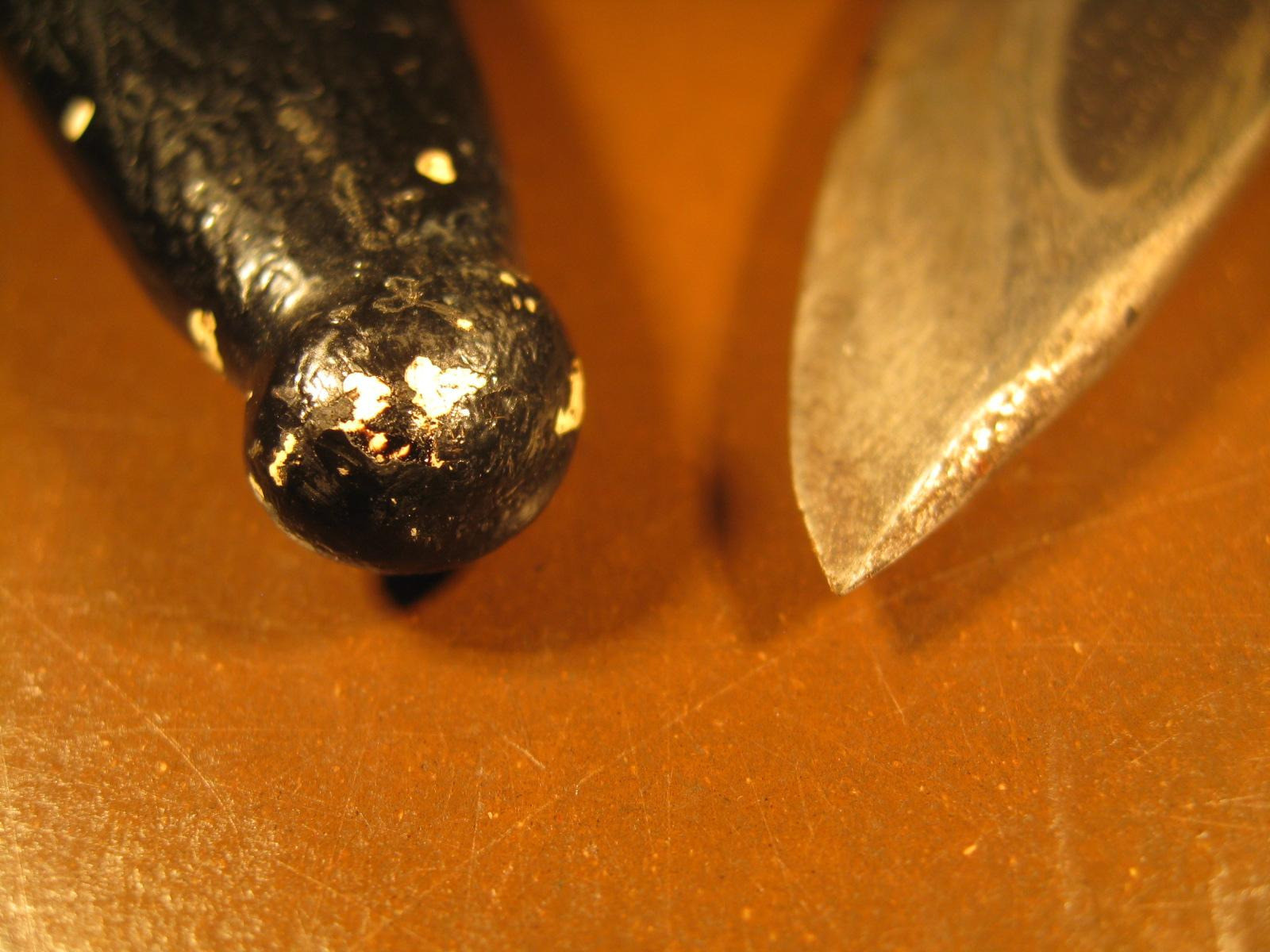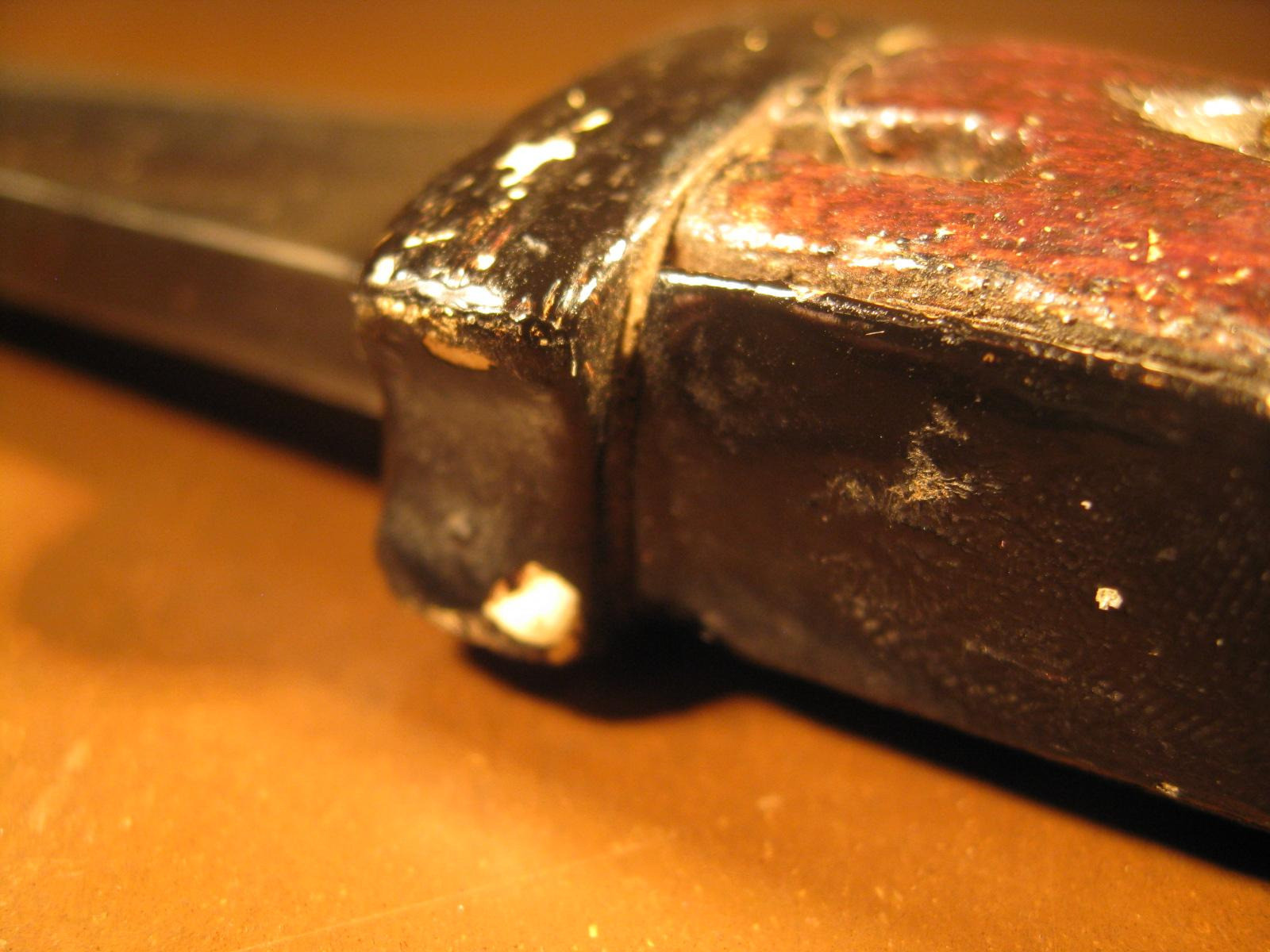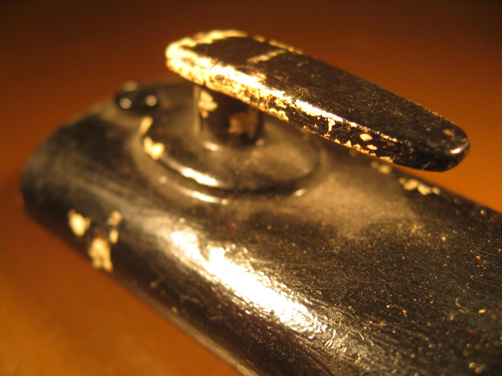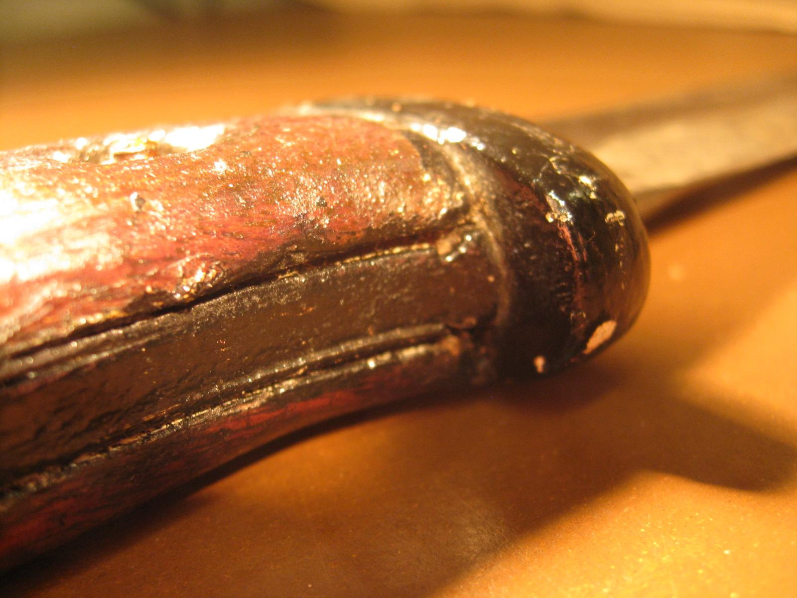 Das Stück ist ziemlich dick mit Farbe bepinselt. Auch der Griff ist mit Lack (?) überzogen.