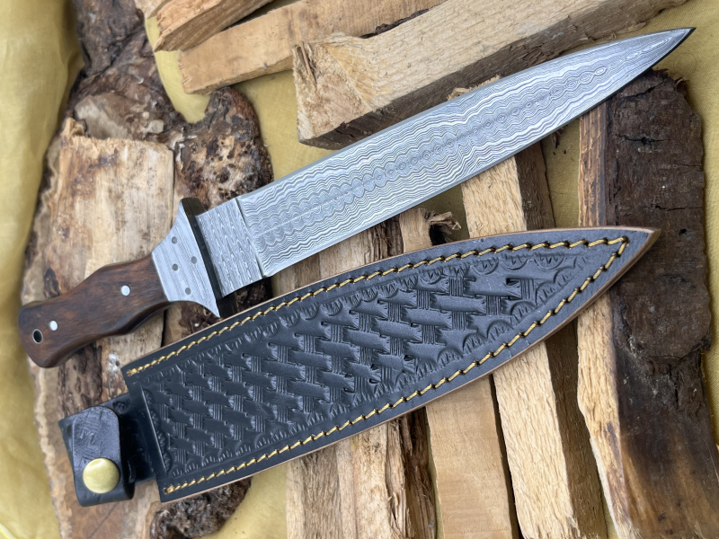 Über 200 Lagen Damast • Dolchmesser • Walnuss-Holzgriff • Damast-Parierelement • Full-Tang Damastklinge • Inkl. Scheide