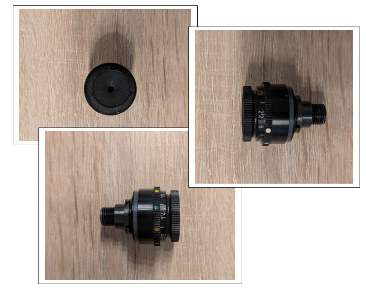 Verstellbare Gehmann Irisblende 0,8 – 2,2 mit Farbfilter 2x grau, 2x gelb, 1x grün