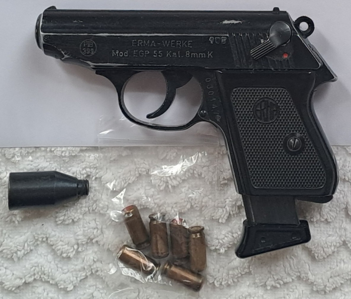 +++ Hersteller: "ERMA" (Erfurter Maschinen- und Werkzeugfabrik Berthold Geipel GmbH) / Herstellerbezeichnung: ERMA EGP 55 / Vorbild: "Walther TPH" / Munition: Gas- und Platzpatronen / Kapazität: Magazin mit 5 Patronen + 1 Patrone im Lauf / Daten: Länge 137 mm; Höhe 100 mm; Breite 23 mm; Gewicht 440 g / Alter: Nicht bekannt; vermutlich hergestellt 1980'er Jahre. / Beschusstest: Keiner / Trockentest: Alle Teile beweglich; alles rastet gut ein und aus; Schlagbolzen beweglich; keine Fehlfunktionen; augenscheinlich voll funktionsfähig. / Zustand technisch: Guter bis sehr guter gebrauchter Zustand / Zustand optisch: Brünierung an hervorstehenden Kanten deutlich abgerieben; wenige kleine und unauffällige Kratzer / Brünierung: Schwarz glänzend / Abzug: Double-Aktion, auch beim ersten Schuss. / Laufsperre: Nach etwa 10 mm einwärts; nicht sichtbar; sog. "scharfe Mündung". / Stempelungen linke Seite: PTB 399; ERMA-WERKE; Mod. EGP 55 Kal. 8 mm K; Bundesadler; Wappen; 030147 / Stempelungen rechte Seite: Made in W. Germany / Hinweise: Als Selbstverteidigungswaffe für unterwegs geeignet (hingegen sollte man im Hause keine Gaspatronen abfeuern); Star an Sylvester; begehrtes Sammlerstück weil der Hersteller ERMA seit 1997 nicht mehr existiert bzw. das Exponat nicht mehr hergestellt wird; deutsche Wertarbeit; teilweise Stahl; unverwüstlich. Weiterer Hinweis: Die Repetiertechnik ist - wie bei allen Pistolen dieser Zeit - eingestellt auf die handelsübliche Munition der 1980'er Jahre. Hingegen ist die heutige Munition etwas schwächer. Wenn das Repetieren nicht zuverlässig funktioniert, sollte eine Schraube zum Stauen des Gasdrucks (Stauschraube) in das Gewinde für den Schießbecher gedreht werden. / Lieferumfang: Pistole; Magazin; 6 sehr alte Gaspatronen; Schießbecher, Farbausdruck einer gescannten Bedienungsanleitung (Original-Bedienungsanleitung und Original-Verpackung nicht mehr vorhanden). / Verkauf und Versand: Nur Deutschland; keine Inseln. +++