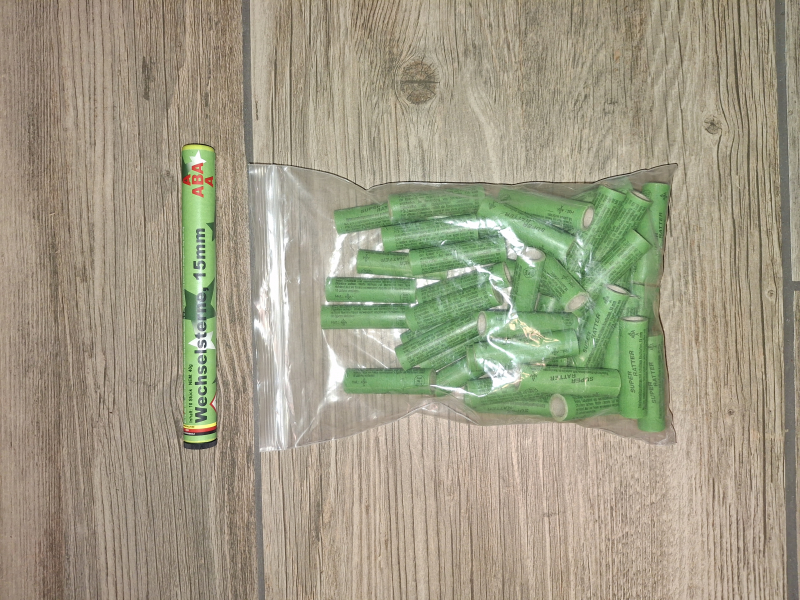 Ich verkaufe einen Restbestand von ca. 43 ABA Super Ratterpatronen plus 8 ABA Wechselsternen zum Verschießen aus zugelassenen PTB-Schreckschusswaffen mit 15mm-Zusatzlauf. Abgabe nur an volljährige Personen (Altersnachweis bitte nach Auktionsende unaufgefordert per Mail an mich senden). Der Versand erfolgt sofort nach Zahlung per Hermes Paket S. Bei Fragen gern an mich wenden. Wichtiger Hinweis: Ich übernehme als Verkäufer keine Gewährleistung und keine Rücknahme, da es sich um einen Privatverkauf handelt. Die Patronen können durchaus Alterserscheinungen aufweisen, da ich meine Sammlung pyrotechnischer Munition auflöse. Die Ware stammt teilweise aus dem ABA-Werksverkauf, teilweise aus Onlineshops innerhalb der EU. Bitte nur ernstgemeinte Gebote abgeben.