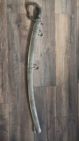 Griff und Klinge in gutem Zustand, die Scheide mit Loch im oberen Bereich (Kampfschaden?).