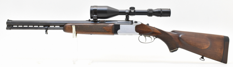 Robuste Bockbüchsflinte aus ungarischer Produktion. Rückstecher im vorderen Abzug, blanke Läufe, strammer Verschluss. Schaftlänge 38,5cm, gemessen vom vorderen Abzug bis Mitte Schaftkappe. Montiert mit einem Lisenfeld ZF 4-12x56Abs. 1. Das Glas hat keine brilliante Durchsicht, leicht milchig trüb.