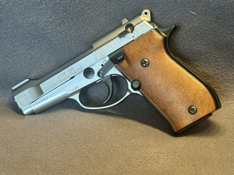 Zum Verkauf steht eine WEIHRAUCH HW94 Stainless-Look, Holz im Kaliber 9 mm Knall. Die Pistole ist ideal für Signal-/Alarmzwecke, Training mit Platzpatronen oder als Sammlerstück.