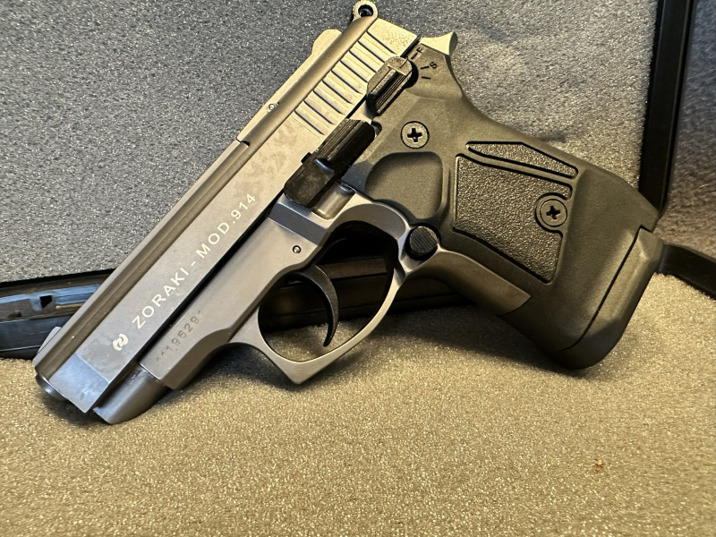 Zum Verkauf steht eine ZORAKI Mod 914 bicolor 9mm P.A.K.. Die Pistole ist ideal für Signal-/Alarmzwecke, Training mit Platzpatronen oder als Sammlerstück.