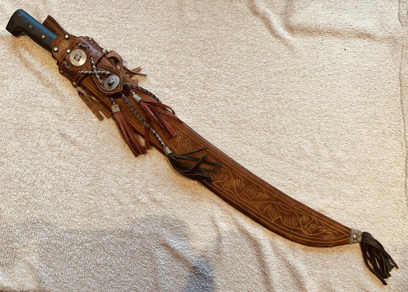 Diese Scheide ist kein Massenprodukt, sondern vermutlich ein lokales Einzelstück, das die Machete deutlich aufwertet.