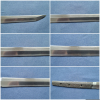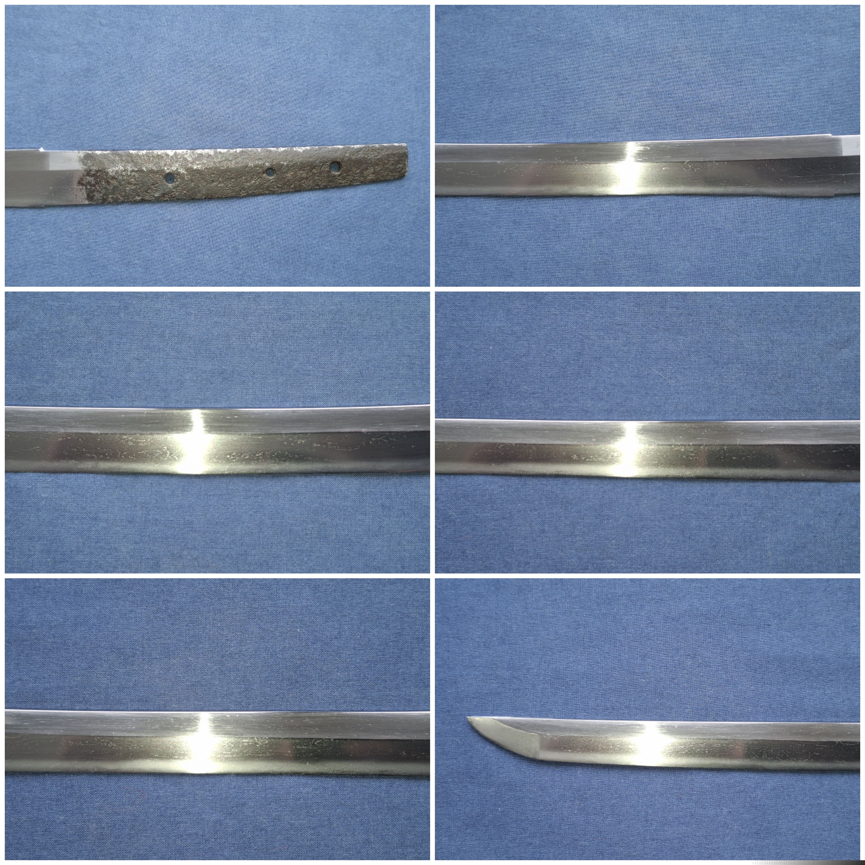 Gesamtlänge Klinge: 88 cm. Nagasa: 69 cm. Motohaba: 3,05 cm. Sakihaba: 1,9 cm. Motogasane: 7,9 mm. Sakigasane: 5,5 mm. Sori: 1,4cm. Gewicht: 680 g. Massive Klinge mit breiter Shinogi. Hamon schon schmal an einigen Stellen.
