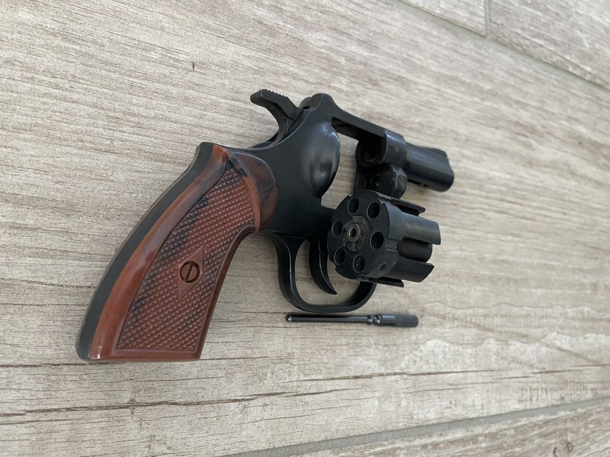 Benutzter Revolver mit Gebrauchsspuren, insbesondere der Abschussbecher ist deutlich abgenutzt.