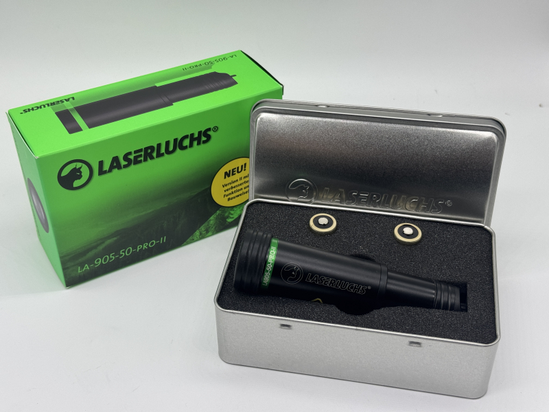 LA905-50-PRO II Linsen-Schutzkappe 2x CR123A Batterien Kundenhandbuch geprägte Laserluchs Metallbox mit Schaumstoffinlay