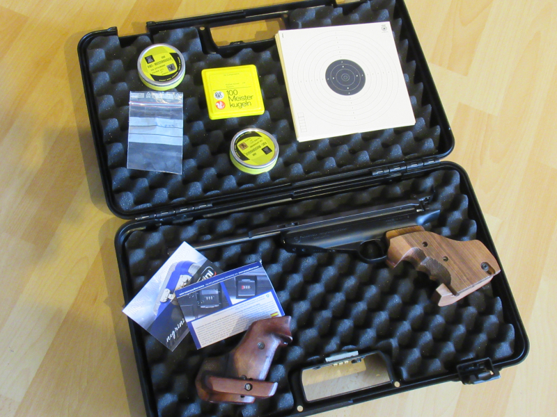 Die Waffe wird mit ein Rink Formgriff welcher genauso wie die Pistole im Top Zustand ist und ein original Feinwerkbau Hartschalenkoffer geliefert .Ein original Feinwerkbau Formgriff ,2 volle Dosen RWS Munition 2 zusätzliche Wechselkorne ,Scheiben gehören auch zum Lieferumfang. Die Schußleistung und Druck ist top.Ich verkaufe alles ohne Garantie und Rückgabe an Personen über 18 Jahre.