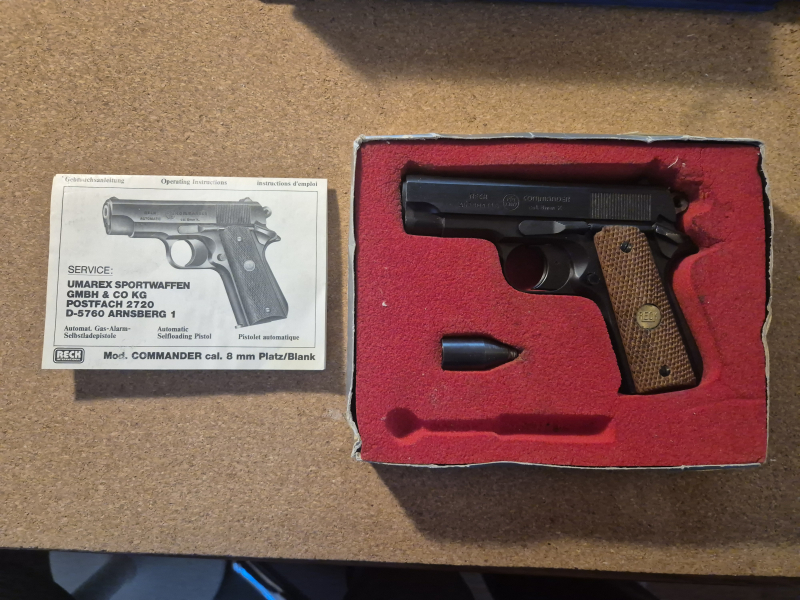 verkaufe eine Reck Commander cal. 8mm aus einer Erbschaft. Die Pistole ist beschossen und hat wie auf den Bildern zu sehen Gebrauchsspuren, Mechanik funktioniert einwandfrei. Originalkarton mit Deckel vorhanden, Bürste und ein Messingplättchen mit Firmennamen auf dem Griffstück fehlen, wie abgebildet.