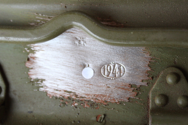 Noch Gut erhalten. Unbeschädigt. Die Farbe an den Stempeln mit einem Brenner gelöst und frei gebürstet, sonst unberührt. Die Farbe ist natürlich nicht Original.