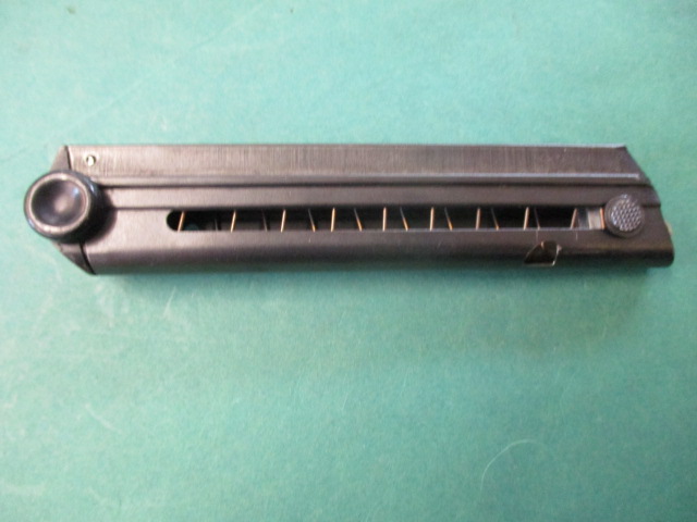 Angeboten wird ein fast neuweriges Magazin für die P 08 , Kal. 9 mm Luger , aus der Nachkkriegsfertigung mit Treppenfeder .