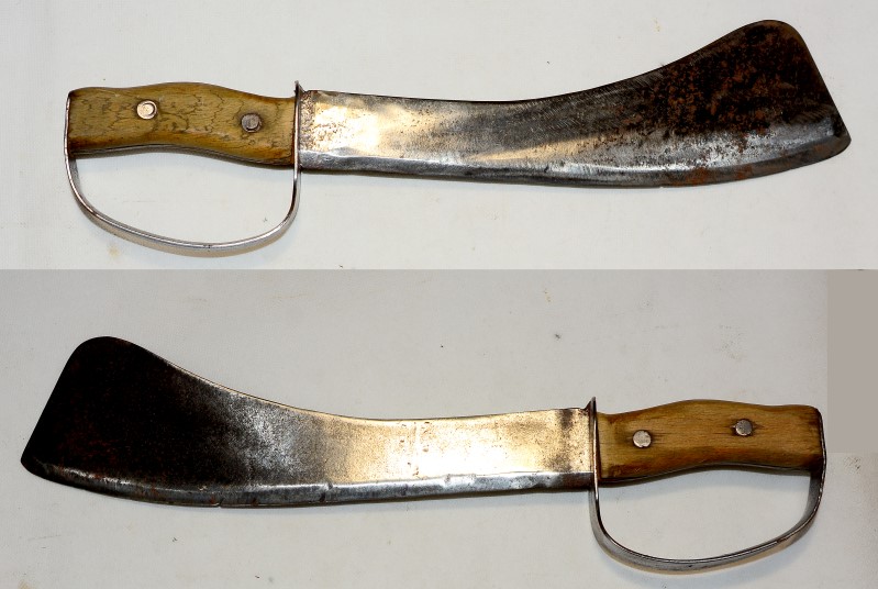 schweres Haumesser aus Osteuropa, Verwendung unbekannt, 30cm lange Klinge, die vorn auf 8,5 cm aufweitet, Bügelgefäß und Holzgriffschalen, Klinge und Griffschalen etwas überschliffen