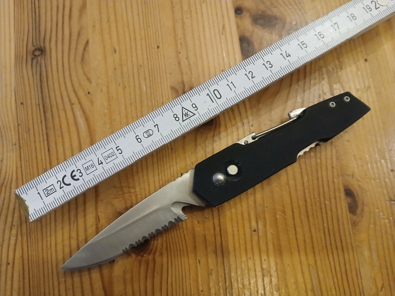 Geboten wird ein praktisches Messer mit einem Karabinerhaken zur Befestigung an der Kleidung/Ausrüstung.