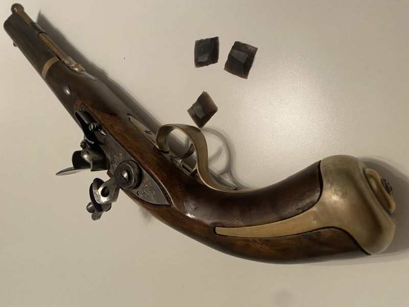 ich habe die Waffe nie geschossen. Ich lege die drei abgebildeten Feuersteine und ein Stück Leder