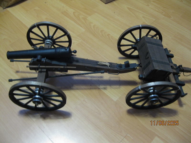 Dahlgreen Kanone 1861 mit Gespann. Kanonenrohr 24cm, Kanone 47cm, Gesamtlänge 97cm, Breite 31cm und 19cm hoch. Kaliber14,4mm. Lauf und Zündloch sind frei gebohrt. Kein Beschuß. Sehr genaue und filigrane Arbeit, Gebrauchtware, keine Garantie, kein Umtausch.