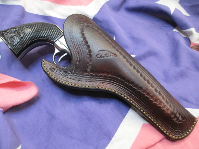 Beboten wird ein von mir in Handarbeit aus Deutschem Rindsleder hergestelltes Holster, Rechtshand ,geradezug. Passt für 5,5 ZB.1873 Saa.Die hier abgebildete Saa1873 in 5,5 zoll sind nicht gegenstand der Aktion. Beboten wird nur das Holster,Rückenschlaufe passst für 7cm Gürtel.