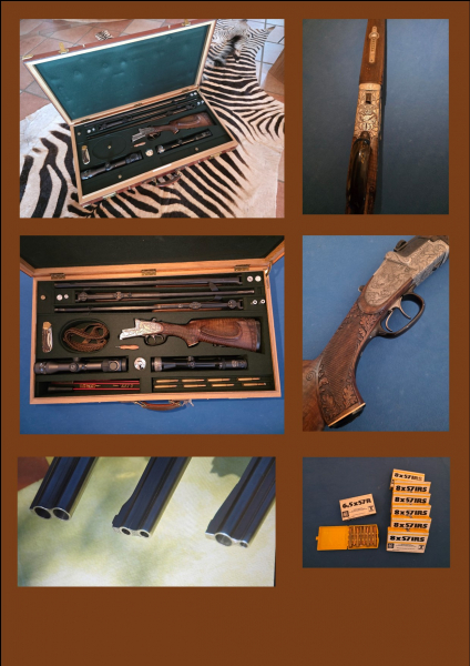 Angeboten wird eine luxuriöse Edelaufführung als Set und Komplettlösung für den jagdlichen Alttag mit lederbezogenen Passformkoffer und viel Zubehör.