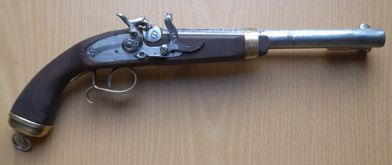 Hallo, ich verkaufe hier eine alte Perkussion Vorderlader Pistole. Sie ist recht alt und hat eine sehr ungewöhnliche Aufmachung. In all den Jahren hier im E-Gun habe ich noch keine Pistole gesehen bei der der Ladestock seitlich angebracht ist. Auch das Kaliber – Laufdurchmesser Innen mit dem Messschieber gemessen ist 18,8 mm – ist mächtig Groß. Auf Grund der gesamten Erscheinung dürfte sie als Reisepistole gelten, auch dürfte sie eher mit eine Art Schrot geladen worden sein als nur mit einer einzelnen Rundkugel wodurch so ein Prügel schon für gehörigen Respekt gesorgt haben sollte. Sie hat etliche Stempel oder Punzen die ich aber nicht deuten kann – Beschussstempel oder der Gleichen wie sie heute üblich sind hat sie natürlich nicht – wer sie wieder reaktivieren will sollte sie vorher einer Revision unterziehen, hier steht jeder selbst in der Verantwortung. Sie dürfte mal von Steinschloss auf Perkussion umgearbeitet worden sein – auch der Hahn macht den Eindruck hier ergänzt worden zu sein. Der Abzugsbügel weist eine Reparaturstelle auf – war wohl mal gebrochen – hier ist mit Sicherheit an der Pistole das eine oder andere Nachgearbeitet oder bearbeitet worden. Ich hatte sie ausschließlich als Sammlerstück nicht zum Schießen und habe mit ihr auch nie geschossen. Über das direkte Alter kann ich nichts sagen. Nur um die Funktion zu testen habe ich ein paar Zündhütchen abgefeuert – spannen und abschlagen hier ist die Funktion gegeben, geschossen habe ich aber mit ihr nie da keine Beschusszeichen zu erkennen sind. Bitte sich die Bilder ansehen, auf Wunsch kann ich aber noch welche zusenden. Hier noch ein Hinweis aus gegebenem Anlass – Sie ist Alt – ist nicht Makellos – hat sicherlich den einen und anderen Fehler – ich beschreibe hier nicht jede Kleinigkeit, ich bin kein Fachmann oder Sachkundiger für alte Vorderlader oder Grundsätzlich für Vorderlader – ich Beschreibe hier alles so gut ich kann und weiß – sie kaufen das was sie sehen. Fragen stellt bitte vorher wer damit nicht einverstanden ist bitte nicht bieten. Und zum Schluss noch das Übliche dies ist ein Privatverkauf daher Garantie - Rückgabe - Umtausch und der gleichen Ausgeschlossen.