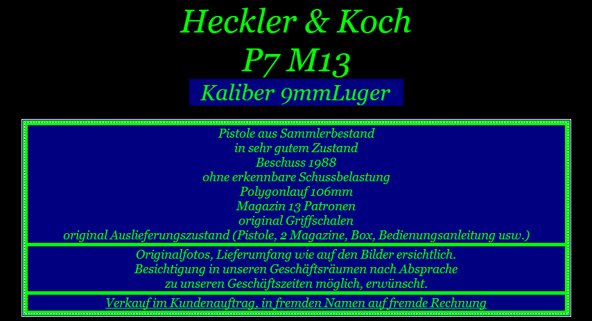 Artikel-ID: 20164759  •  ArtikelNr. des Verkäufers: 12230  •  Kategorie: Grosskaliber Kurzwaffen > Gebrauchspistolen > Heckler & Koch