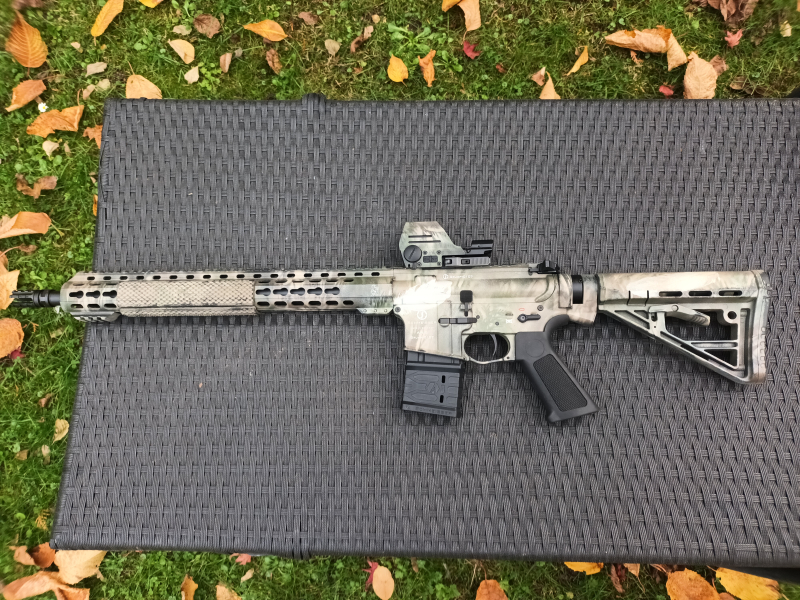 Die Waffe ist vom Vorbesitzer mit ungefähr 300 Schuss belastet worden. Den Zustand der Waffe und der Lackierung würde ich als gebraucht, aber dennoch gut betiteln. Zusätzlich im Lieferumfang enthalten ist ein Falke LE Rotpunktvisier, dass in der gleichen Waldtarnung wie die Waffe lackiert wurde. Außerdem wird eine Schmeisser Gewehrtasche mitgeliefert, eine originale Bedienungsanleitung sowie mehrere Wechselmagazine und Putzzeug.