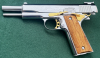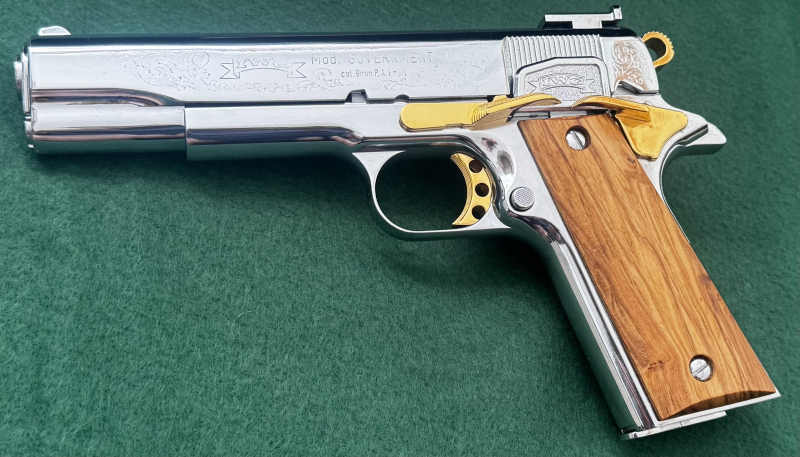 Eine IWG 1911 Government Sport Club cal. 9mm P.A. Knall, PTB 668 Verchromt/ Bedienelemente vergoldet mit tollen hellen Holzgriffen.