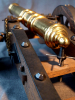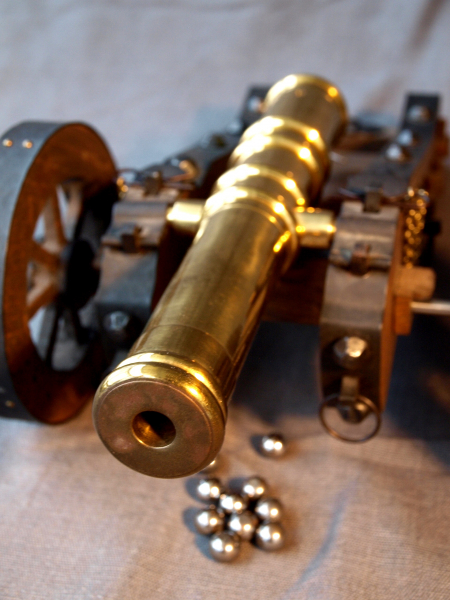 Biete ein eindrucksvolles Modell einer historischen Vorderlader-Feldkanone. Das knapp 30 cm lange Modell imponiert durch sein, im reinsten Wortsinn, strahlend schönes Erscheinungsbild. Hierzu trägt in erster Linie das ausgesprochen Gold glänzende, ca. 20 cm lange Kanonenrohr bei. Es scheint sich um vergoldetes Messing zu handeln. Der 8 mm messende, saubere und glatte Lauf ist mit dem etwa 1,5 mm messenden Zündloch verbunden, was unser Geschützmodell beschussfähig macht. Das Rohr ist auf einer schöne gebeizten, massiven Eichenholzlafette montiert. Die Lafette verfügt über solide, stählernen Beschlagwerke und ebenso ausgeführte Schildzapfenschlösser. Das hübsche Geschütz verfügt über eine sog. Richtmaschine – also eine Spindel, die für die Höhenjustierung des Rohres zuständig ist. Es handelt sich um ein ausgesprochen schönes und „glanzvolles“ Modell eines historischen Kanonentyps. Da das Rohr beschussfähig ist, findet ein Verkauf nur an volljährige Personen statt.