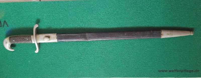 Badisches Polizei Seitengewehr um 1900. Vernickelte Griffteile, gewaffelte Holzgriffschalen. Auf Fehlschärfe eingeschlagen Hersteller CARL EICKHORN SOLINGEN. Dazugehörige schwarze Lederscheide mit vernickelten Beschlägen. Privatauktion ohne Gewährleistung, ohne Garantie, keine Rücknahme.
