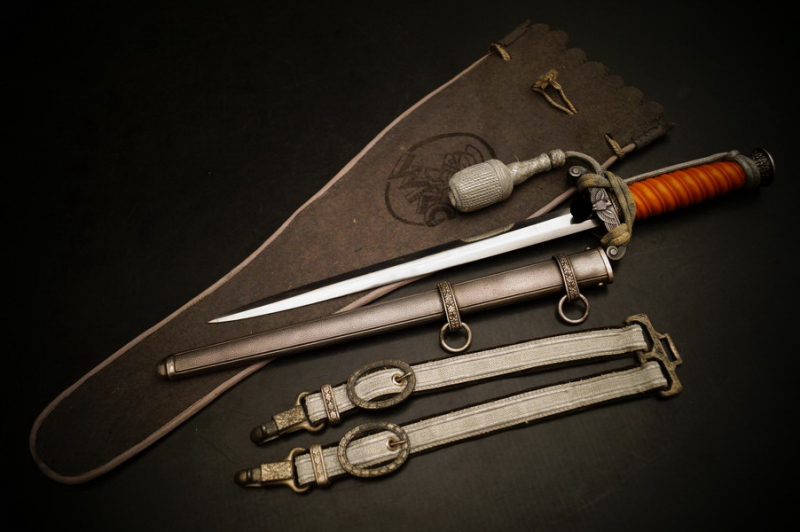 Fundzustand. Dolch in der seltenen Ausführung mit versilberter Neusilber-Parierstange ! Und Portepee und Luxus D.R.G.M. Gehänge sowie der dazugehörigen Dolchtasche von WKC. Schönes und sehr seltenes WH Dolch Exemplar aus Nachlass. WK2