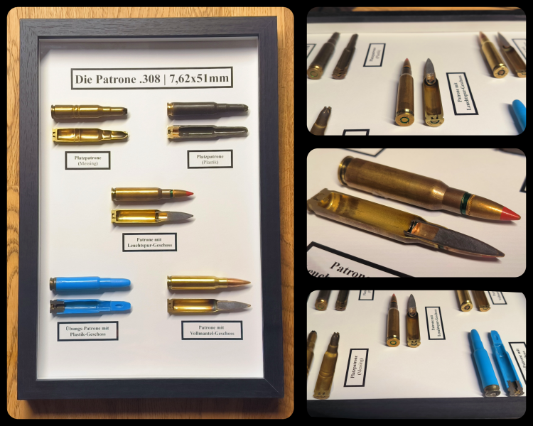 Sehr schöner Schaukasten mit Schnittmodellen zur Veranschaulichung der bekannten Patrone .308 Win / 7,62x51mm in 5 Varianten.
