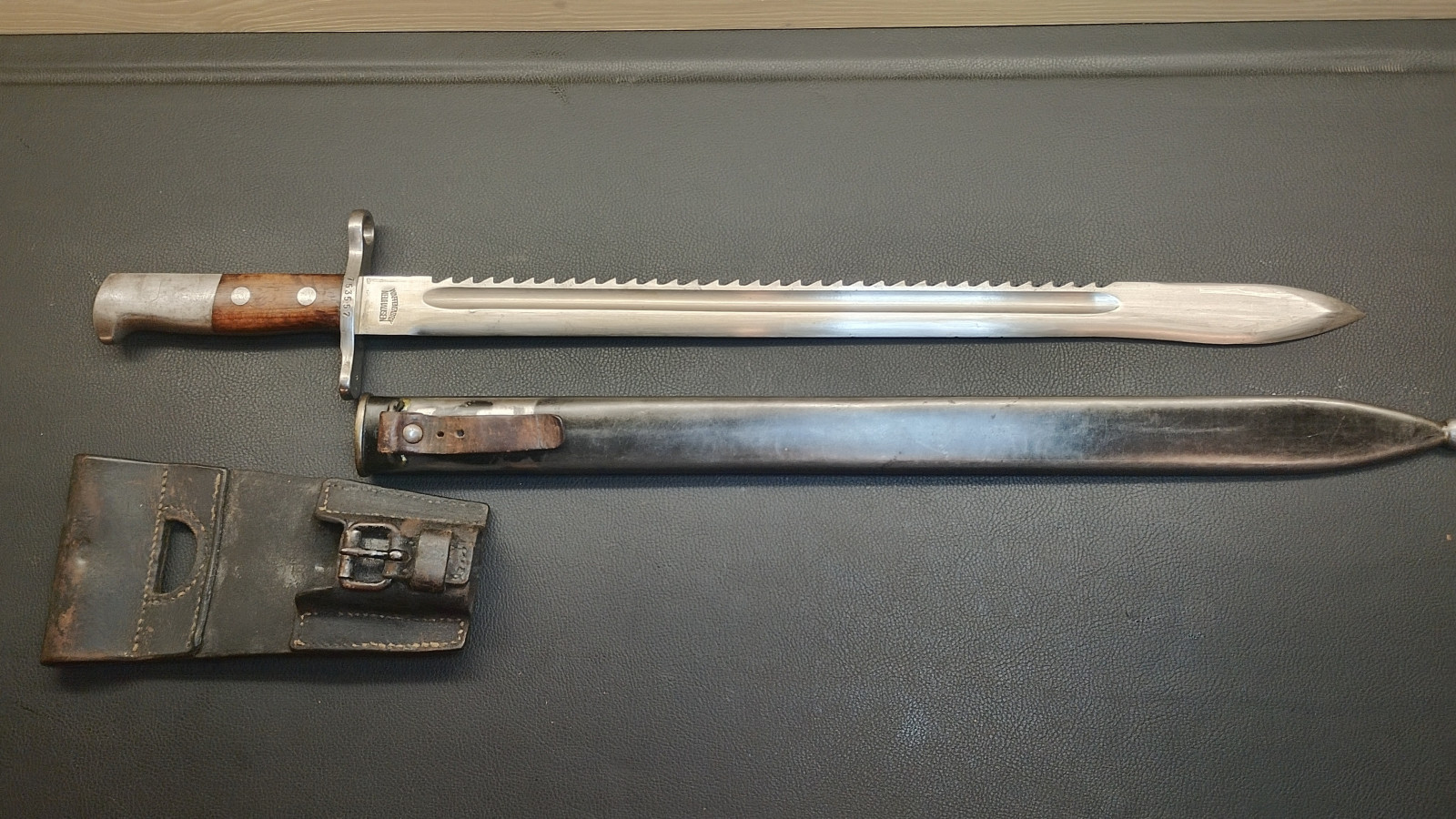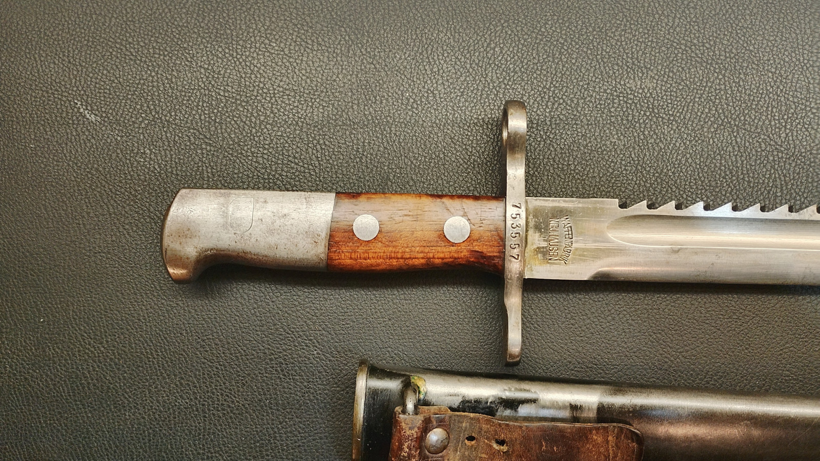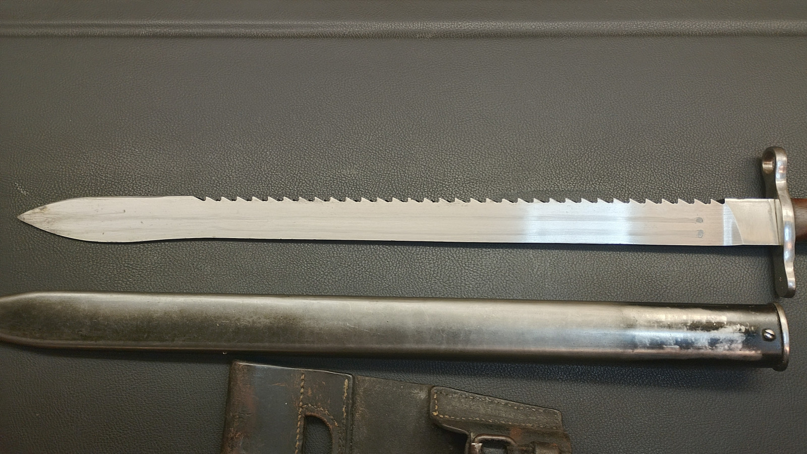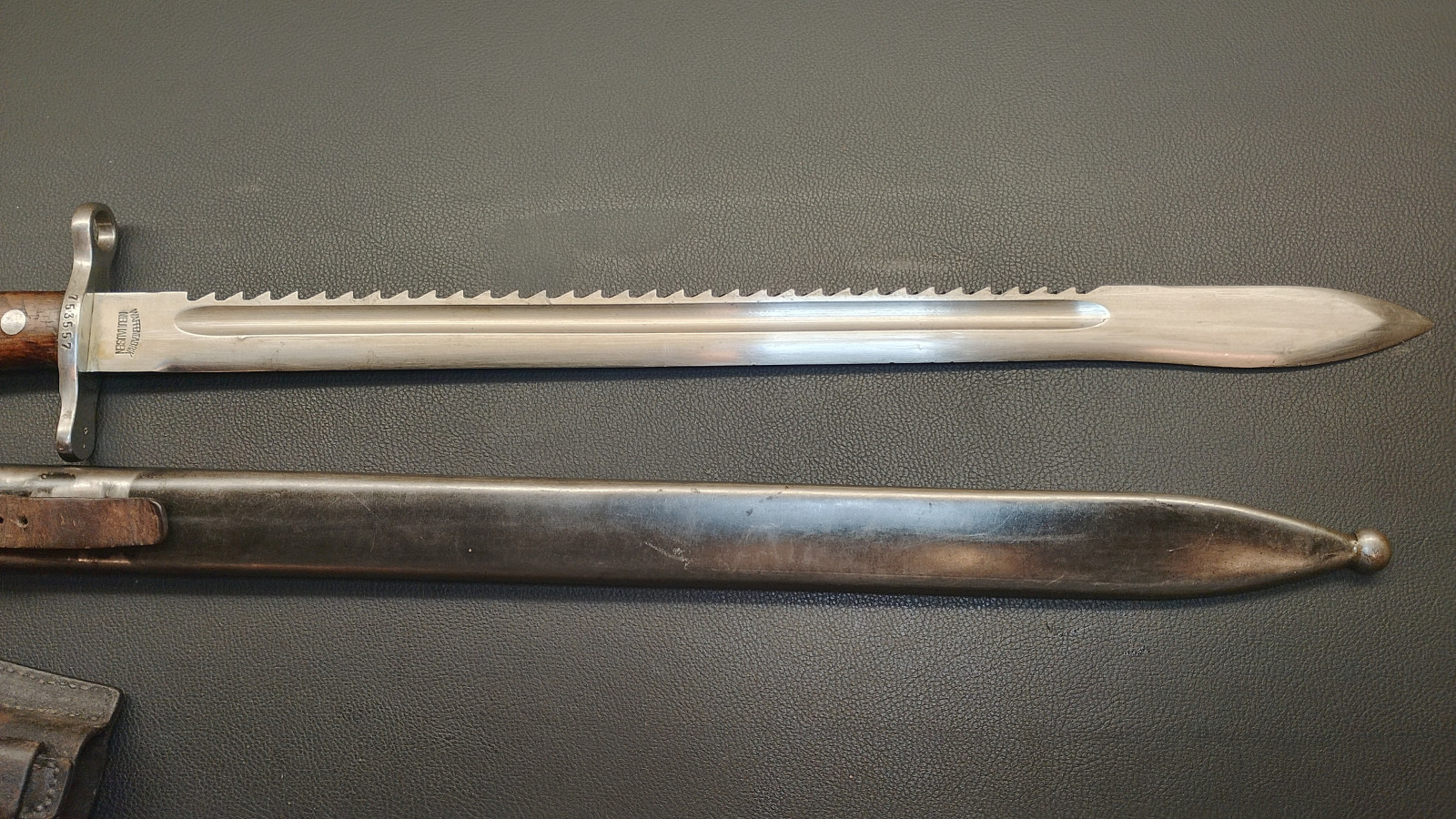 Verkaufe aus meiner Sammlung : Schweizer Pionier Bajonett M1914 mit Sägerücken,Waffenfabrik Neuhausen , Drücker leichtgängig , Klingenlänge 48 cm , Gesamtlänge 61 cm, Koppelschu mit hersteller Prägung,,,J . HOLDEREGGER TEUFEN 1887 . Erhaltungszustand ist Ansichtssache . Bitte schätzen Sie den Zustand des angebotenen Artikels anhand der Bilder selbst ein . Bilder sind Gegenstand der Auktion