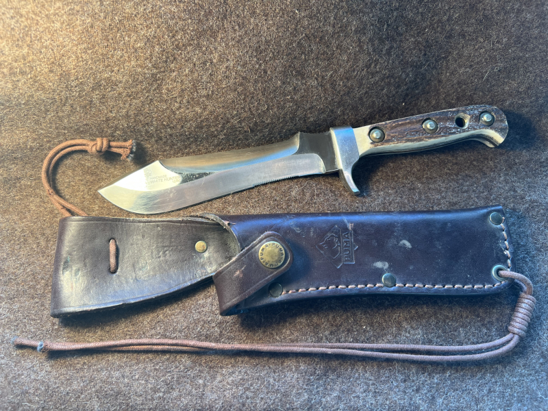 Sie bieten hier auf ein gebrauchtes Puma White Hunter 12/RC. Seriennummer: 11 6375. Das Messer befindet sich in einem gebrauchten, aber sehr guten Zustand. Klingenausbrüche kann ich keine erkennen. Zum Messer gehört die passende Messerscheide in einem ebenfalls gebrauchten Zustand.