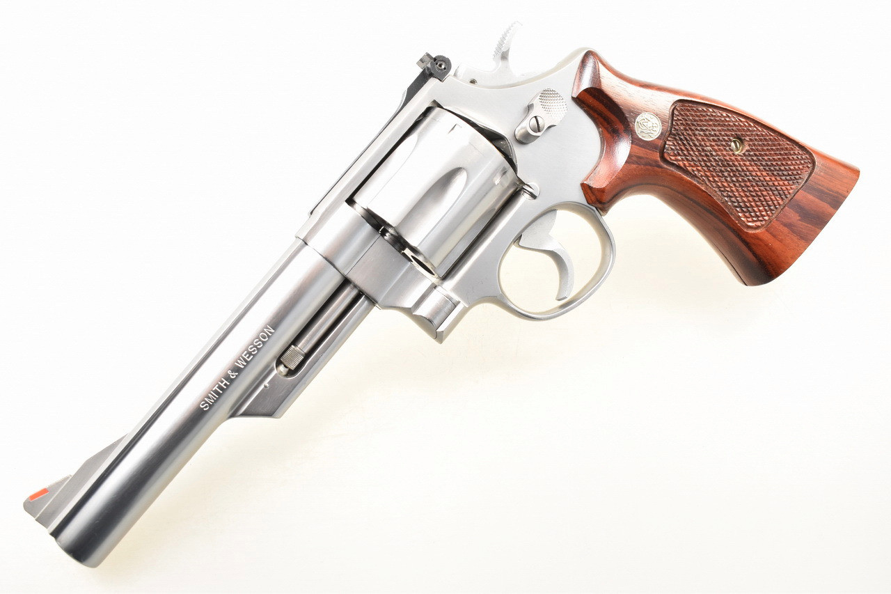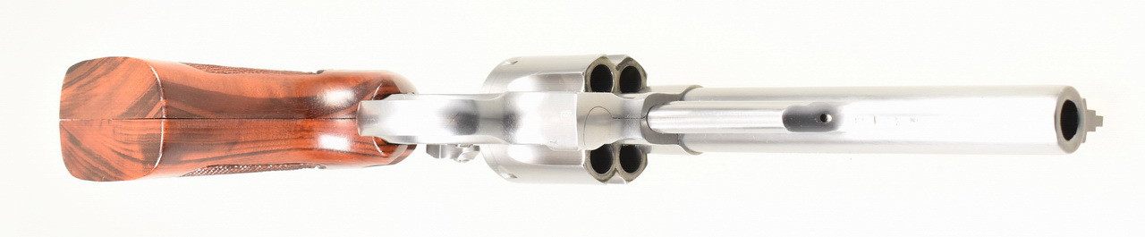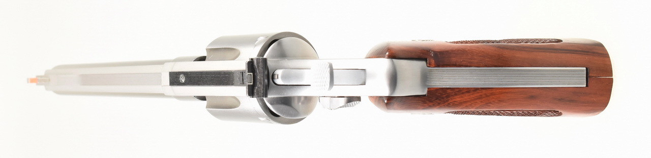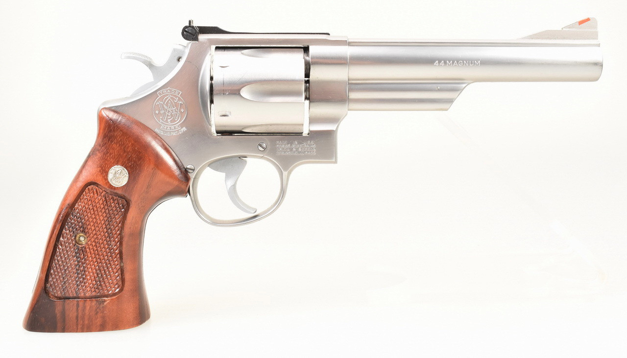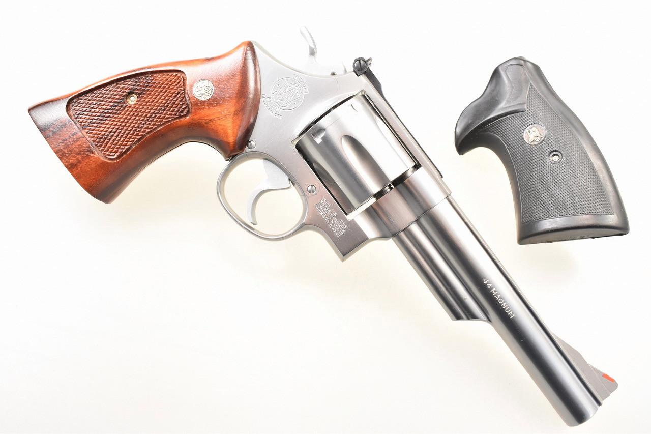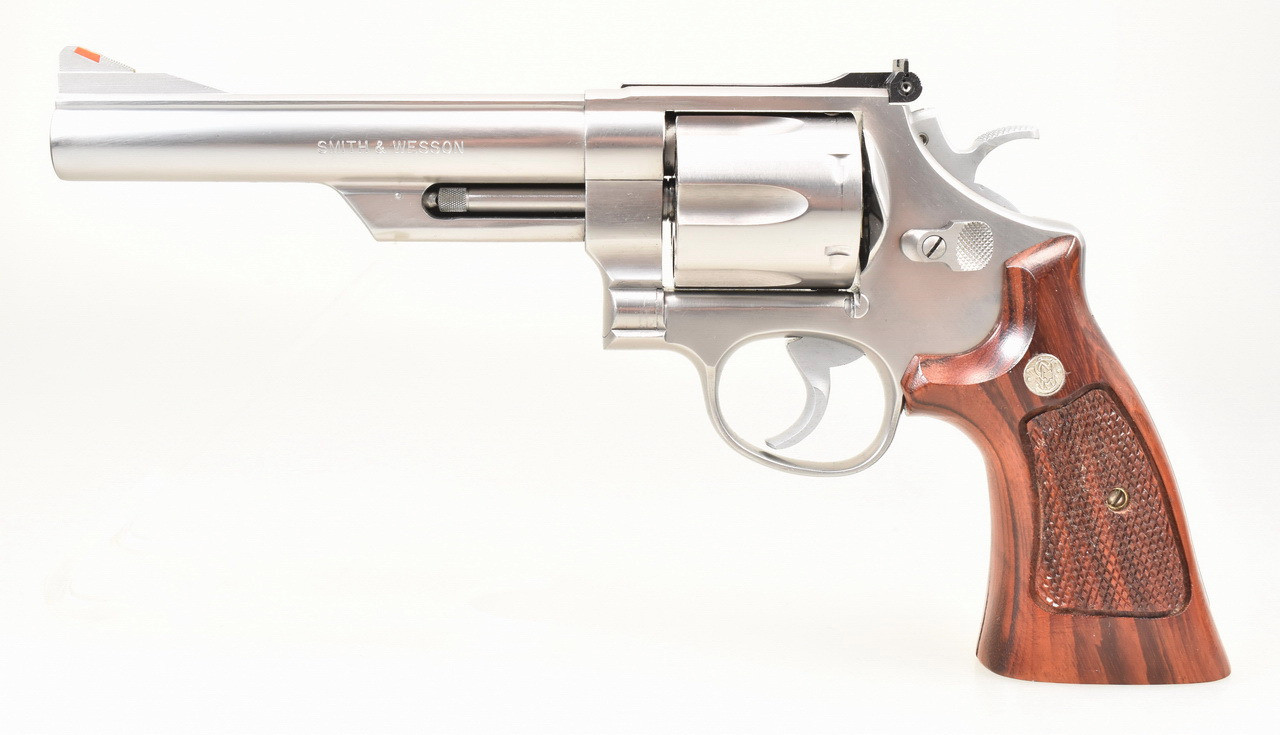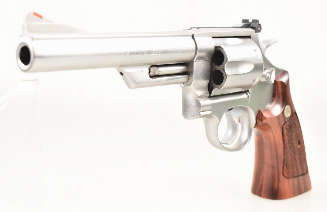 Leicht gebrauchter Stainless - Steel Revolver Modell 629 - 1 des bekannten amerikanischen Herstellers Smith & Wesson. Spiegelblanker Lauf. Belgischer Beschuß. Wischo Vertriebsstempel. Höhen- und seitenverstellbare Visierung mit White Outline Kimmenblatt. Rampenkorn mit roter Kunststoffeinlage. 195mm lange Visierlinie. Originale S&W Holzgriffschalen mit Fischhautmuster und Pachmayr Presentation Gummigriff.