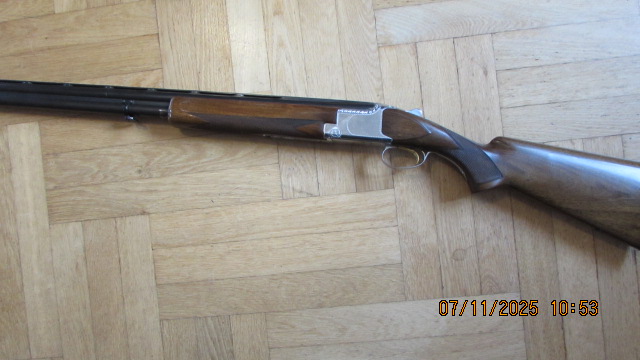 SNR: 30256S74, gültiger Beschuss (kein Stahlschrotbeschuss) ist vorhanden; Verschluss auch bei abgenommenem Vorderschaft dicht, blank gebeizte Basküle, ventilierte und guillochierte 12mm breite zur Basküle auf 7mm verjüngende Laufschiene mit weißem Perlkorn und mittigem Hilfskorn, Schiebe-Umschaltsicherung auf dem Kolbenhals, Ejektoren, Chokebohrungen oben und unten Skeet, rechts geschränkt.