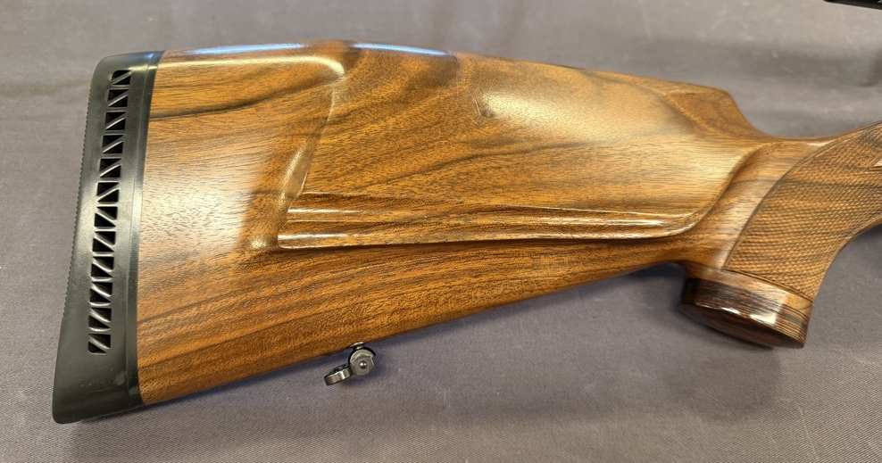 Vom Vorbesitzer ausgesuchter, sehr schön gemaserter und erhaltener Nussbaumschaft in Linksausführung.