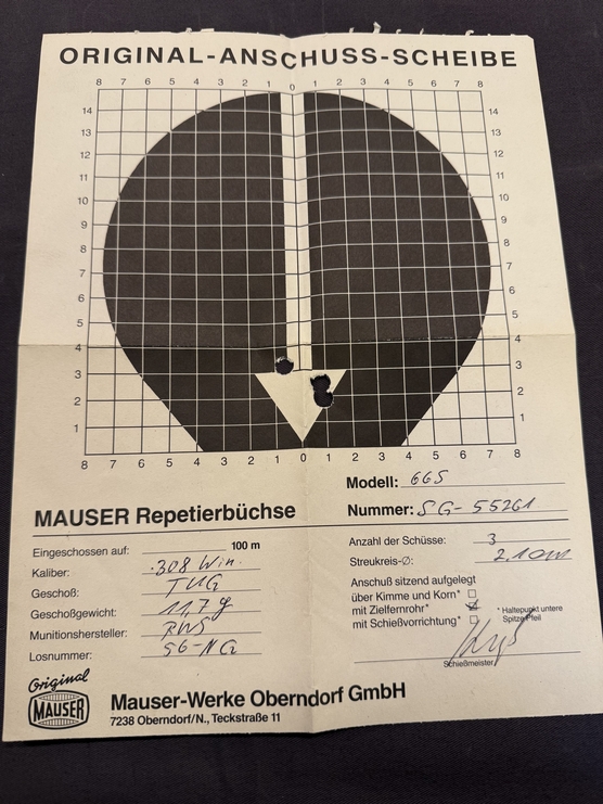 Die Waffe wird mit ZF-Schutzkappen, Bedienungsanleitung und Anschussbild von Mauser geliefert.