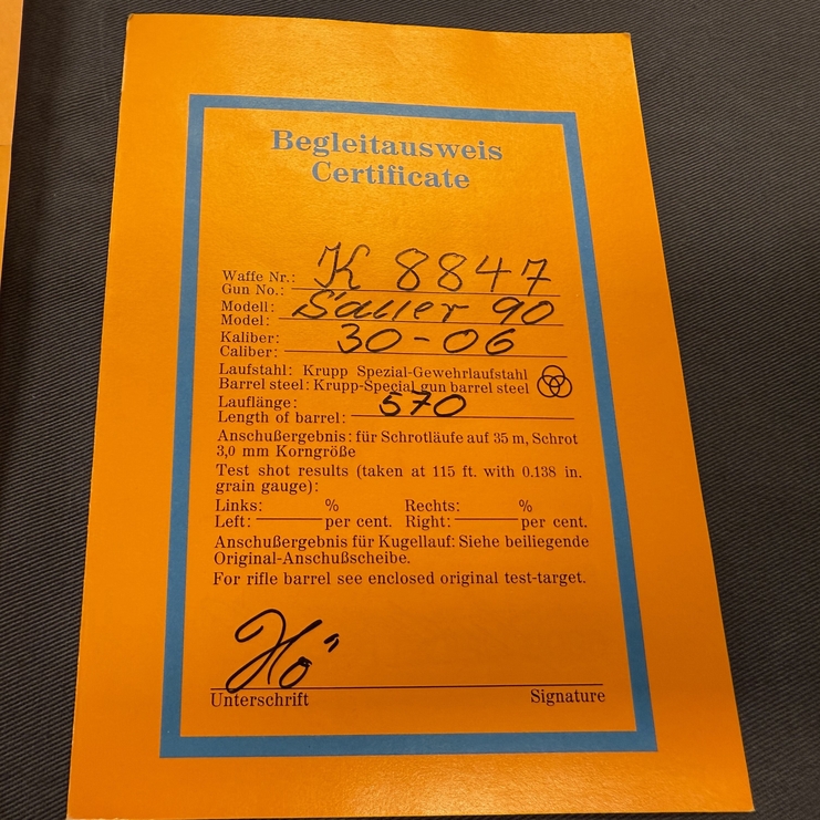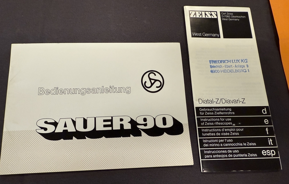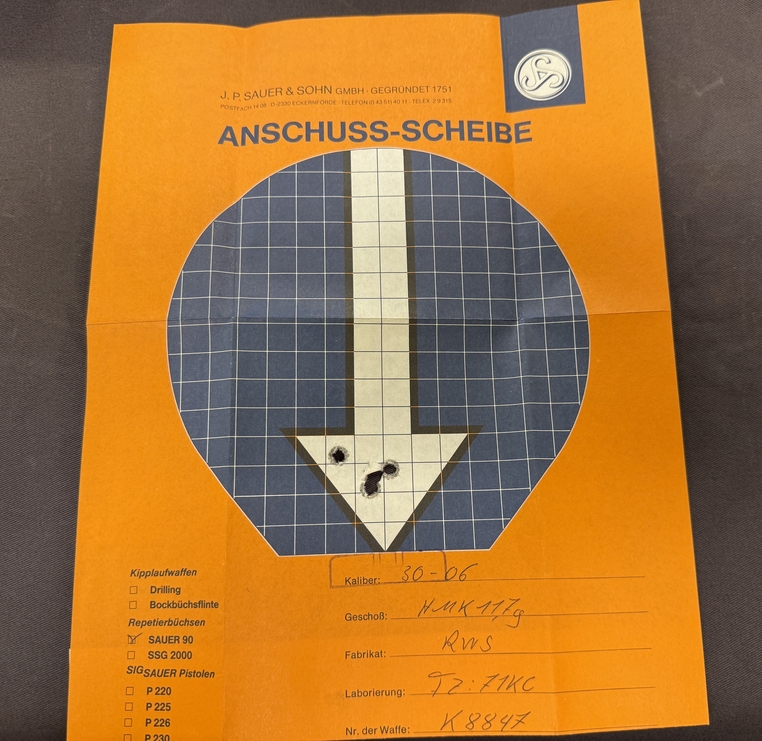 Die Waffe wird mit ZF-Schutzkappen, Bedienungsanleitung, ZF-Bedienungsanleitung und Anschussbild von Sauer geliefert.