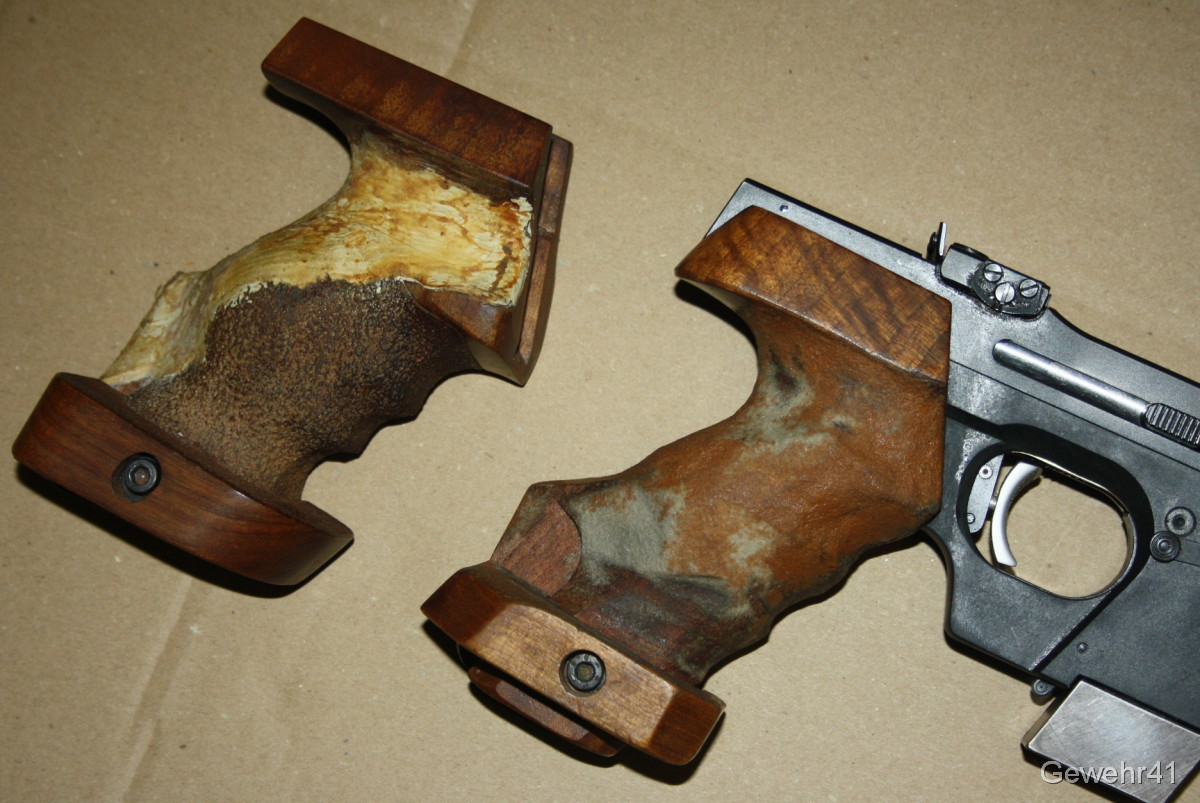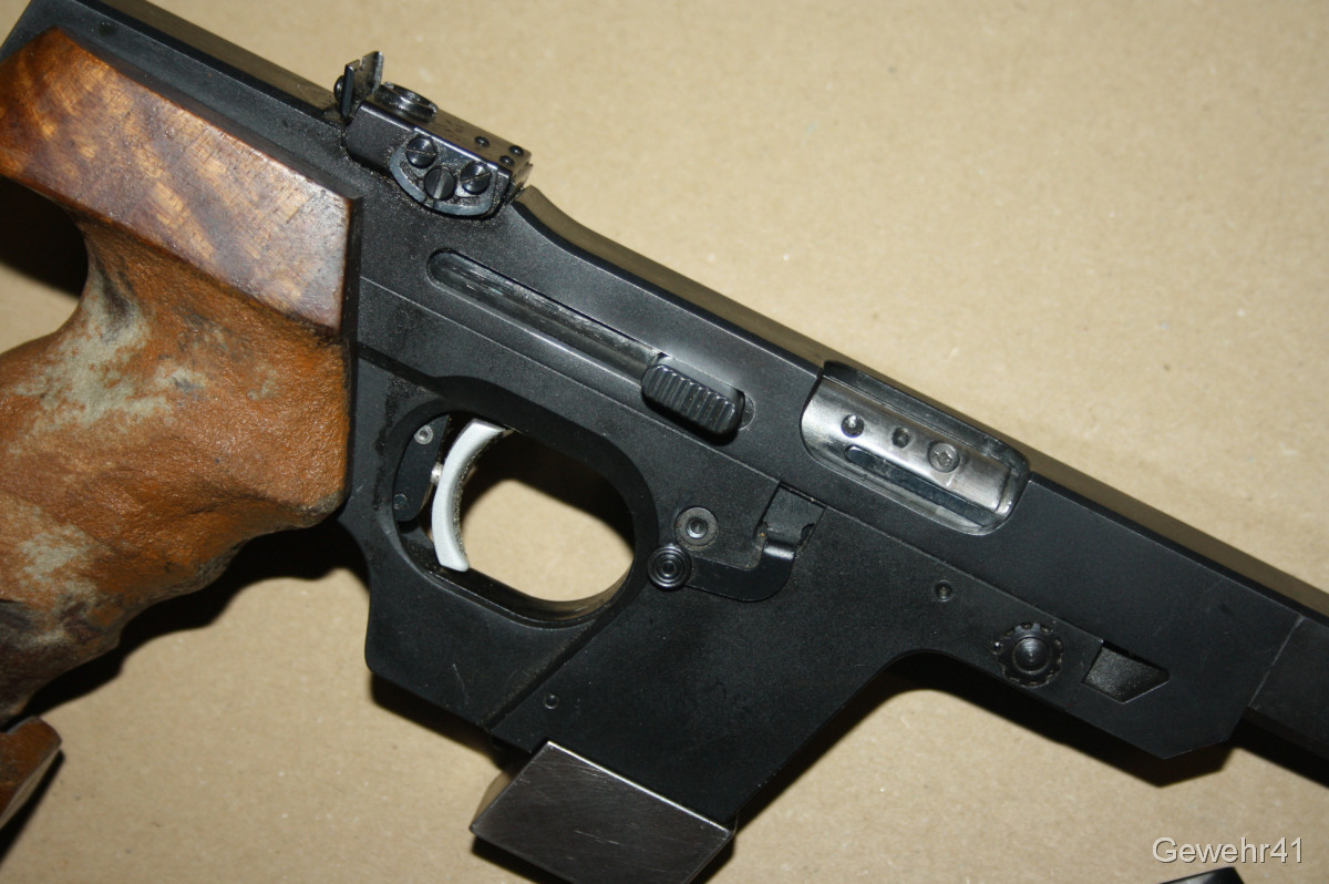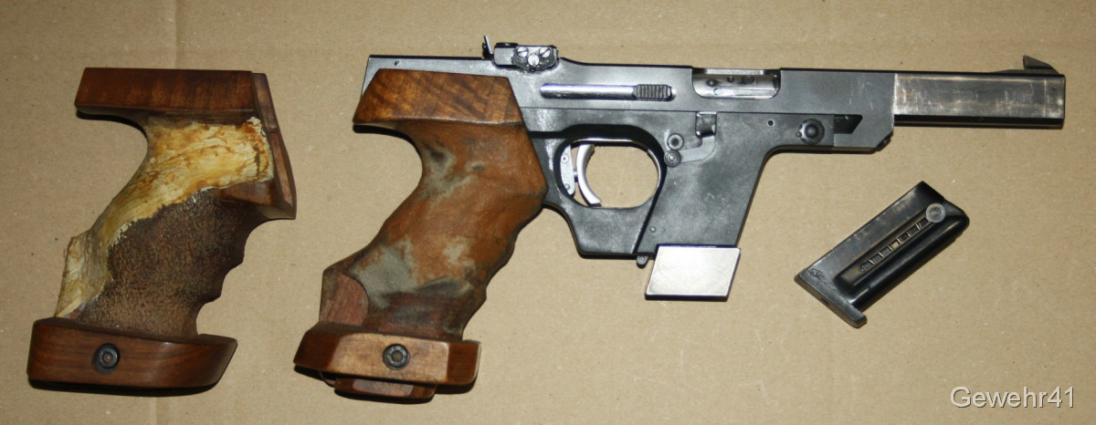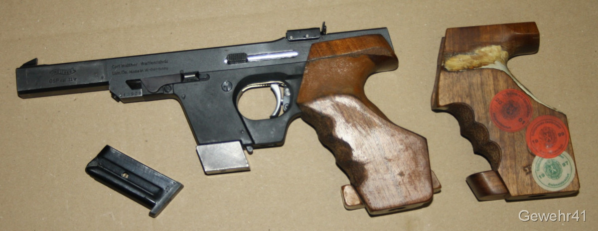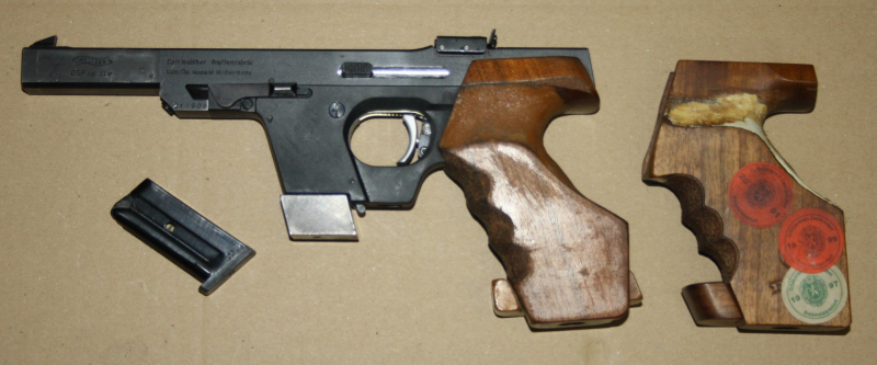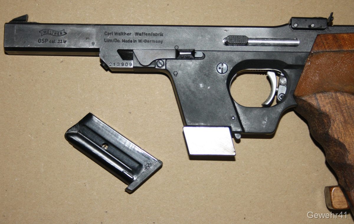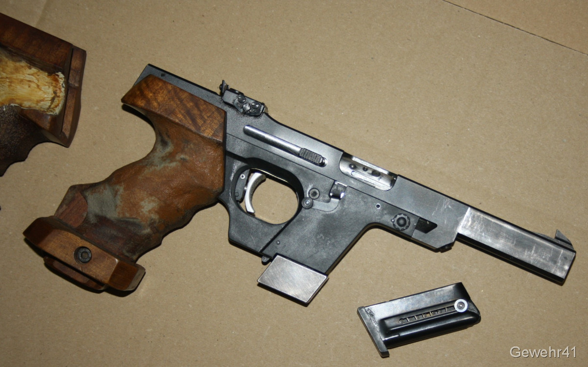Sie bieten auf diese Walther GSP im Kal. .22lfb. Die Pistole ist im guten Zustand mit normalen Gebrauchsspuren. Dazu gibts noch ein Reservemagazin und einen weiteren Sportgriff. Lauf und Funktion einwandfrei.