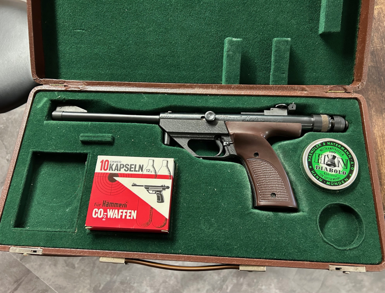 Luftpistole Hämmerli Master mit CO2 Antrieb, Kapsel bläst ab beim Einlegen, Dichtung defekt, im Originalkoffer wie abgebildet, eher zum Sammeln, ist Einzellader für Diabolo, 4,5 mm
