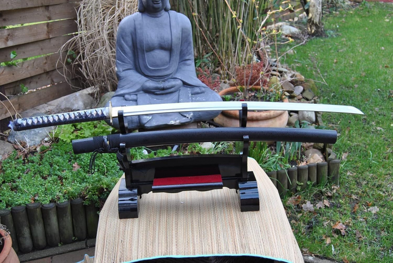 Shiro Handgeschmiedete Gefaltetes Bushido Katana Schwert . von Hand geschmiedeter .Gesamtlänge: 105 cm Klingenlänge 72cm,Grifflänge 28,5cm. Gewicht mit Saya : 1320 gr, Gewicht ohne Saya:1100 gr, lackierte Holz Saya Griffumwicklung aus Baumwolle ist traditionell angebracht das Schwert ist scharf geschliffen Ohne Ständer.